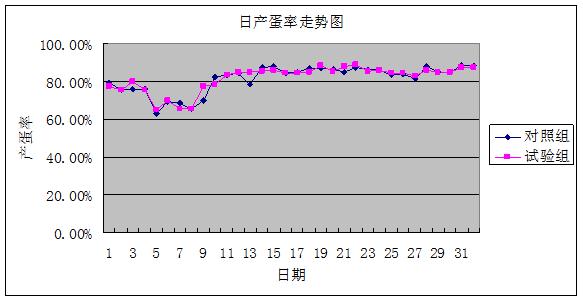 2.3.2 产蛋率 比照组日均产蛋率达81.53%,,,试验组日均产蛋率81.72%,,,试验组比比照组高0.19%,,,差别不显著(P>0.05)。。。。。