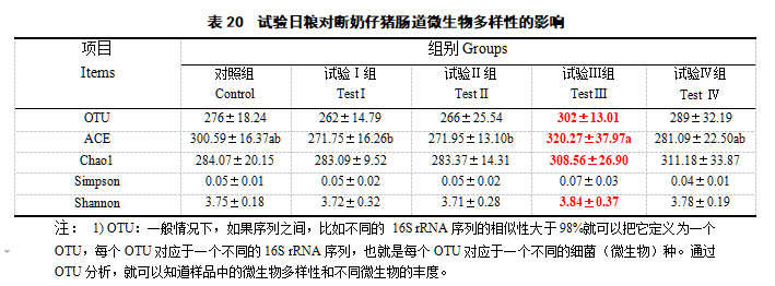 将各处置惩罚组断奶仔猪肠道(空肠)微生物样品举行测序,,,,,并统计各样本的α多样性指数后获得各样本 OTU 数目划分为276(比照组)、262(试验Ⅰ组)、266(试验Ⅱ组)、302(试验Ⅲ组)、289(试验Ⅳ组)。。。。。。Chao1 指数、ACE 指数和Shannon指数 、Simpson 指数体现微生物群落结构的转变状态。。。。。。其中,,,,,Chao1 指数和ACE 指数越高,,,,,批注群落富厚度越高,,,,,Shannon指数越高,,,,,批注群落物种的多样性越高。。。。。。