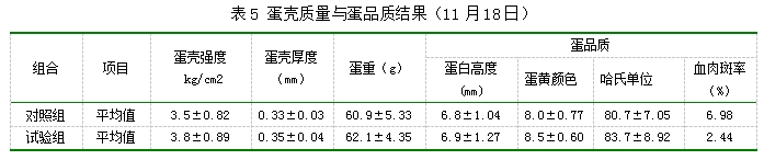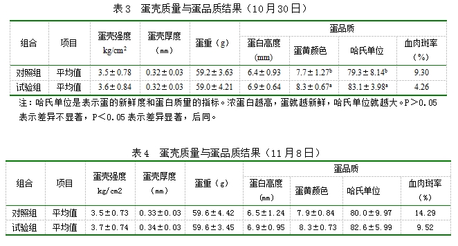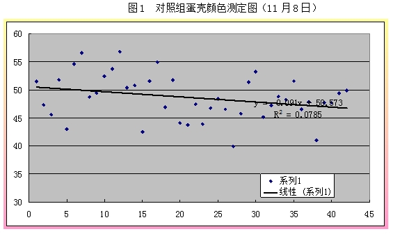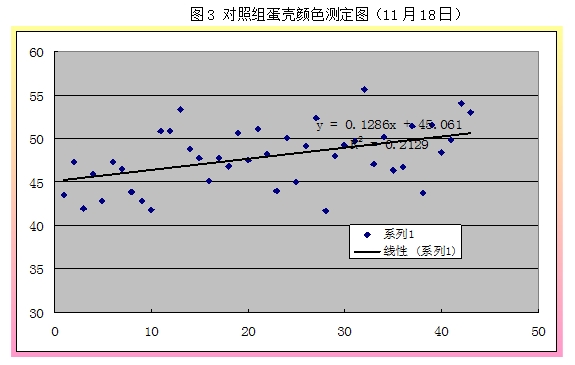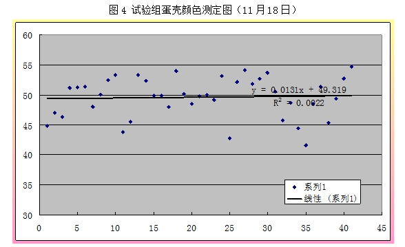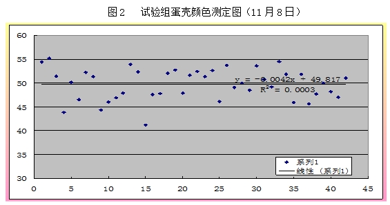 从上表可以看出,,,,,,,11月8日数据中,,,,,,,试验组的蛋壳颜色在49.7,,,,,,,高于比照组2.07%(P>0.05),,,,,,,11月18日测定的蛋壳颜色中试验组为49.6,,,,,,,高于比照组3.57%(P<0.05)。。。。效果说明,,,,,,,试验组的蛋壳